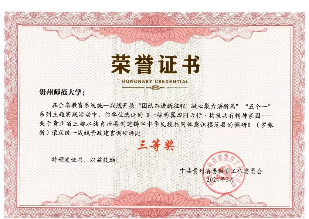祝贺贵州师范大学教育学院教师罗银新在全省教育系统统一战线开展“团结奋进新征程 凝心聚力新篇章”“五个一”系列主题实践活动中,荣获统一战线资政建言调研评比三等奖。