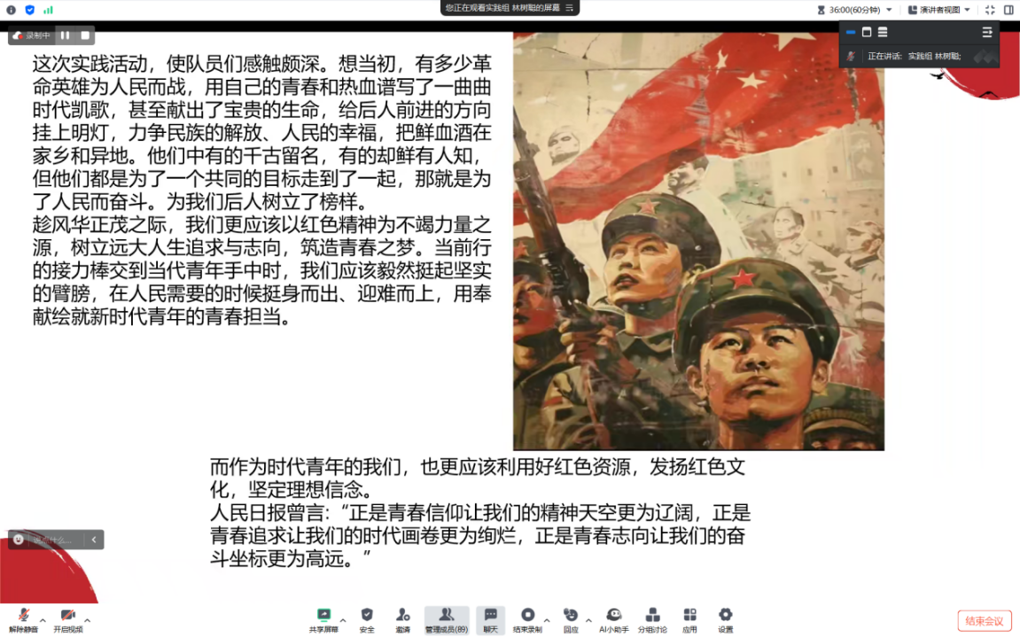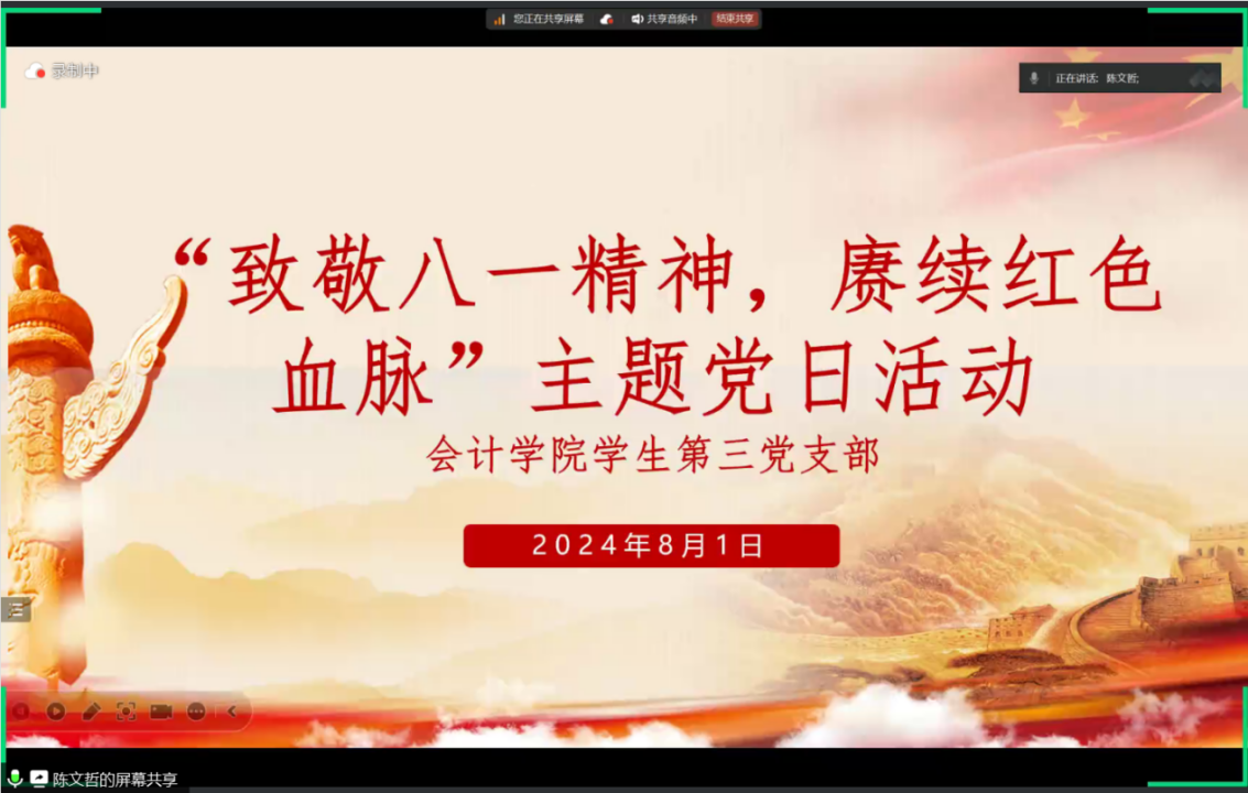 会计学院学生第三党支部以习近平新时代中国特色社会主义思想为指导,全面贯彻党的二十大和二十届三中全会精神,落实立德树人根本任务,进一步增强党员的党性修养,提升党员的思想政治素质,发挥好党支部的战斗堡垒作用和党员的先锋模范作用。会计学院学生第三党支部积极推进“党建育人+思想引领”专项模块建设,于2024年8月1日通过线上会议的形式开展以“致敬八一精神,赓续红色血脉”为主题的理论学习主题党日活动。