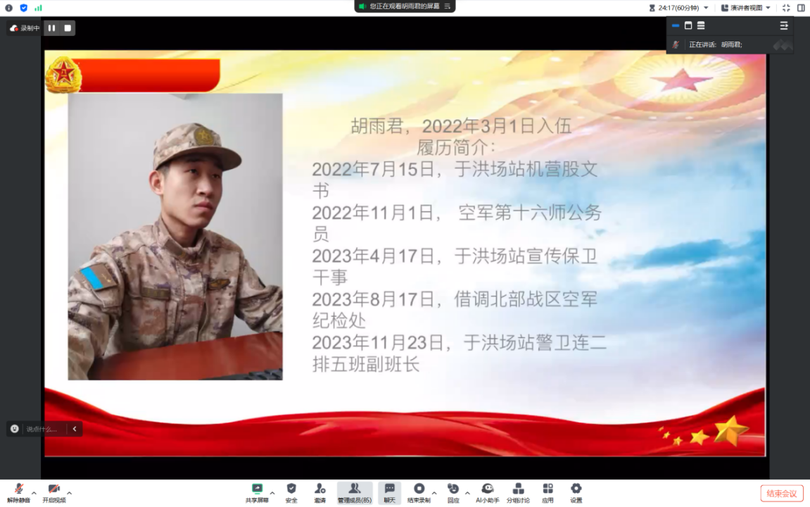 接着,退伍学生代表胡雨君同志在线上分享自己丰富的军旅生活。在此过程中,他讲述了自己投身军旅的初心和使命,细说了自己是如何在接受军营的锤炼和教育后,实现从初入军营懵懂无知到意志坚定全身心投入高强度训练的转变。在告别军旅生活后,胡雨君同志回忆起那一段军旅生涯,由衷地感谢部队生活给他个人素质带来的全方位提升,部队生活锻炼了他的意志力,坚定了他的理想信念,同时他鼓励各位同志投身到国防事业中去,让青春在军营中绽放光彩。