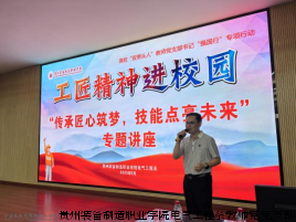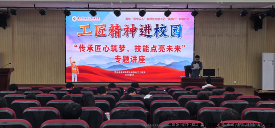 为深入贯彻落实党的二十大及二十届三中全会精神,培育新时代高素质技能人才,5月19日下午,贵州装备制造职业学院电气工程系教师党支部在博学楼道德讲堂举办“传承匠心筑梦,技能点亮未来”工匠精神进校园专题分享会。中国振华集团永光电子有限公司高级主任工程师曾令军应邀担任主讲嘉宾,200余名学生代表现场聆听了这场充满力量与温度的匠心分享。