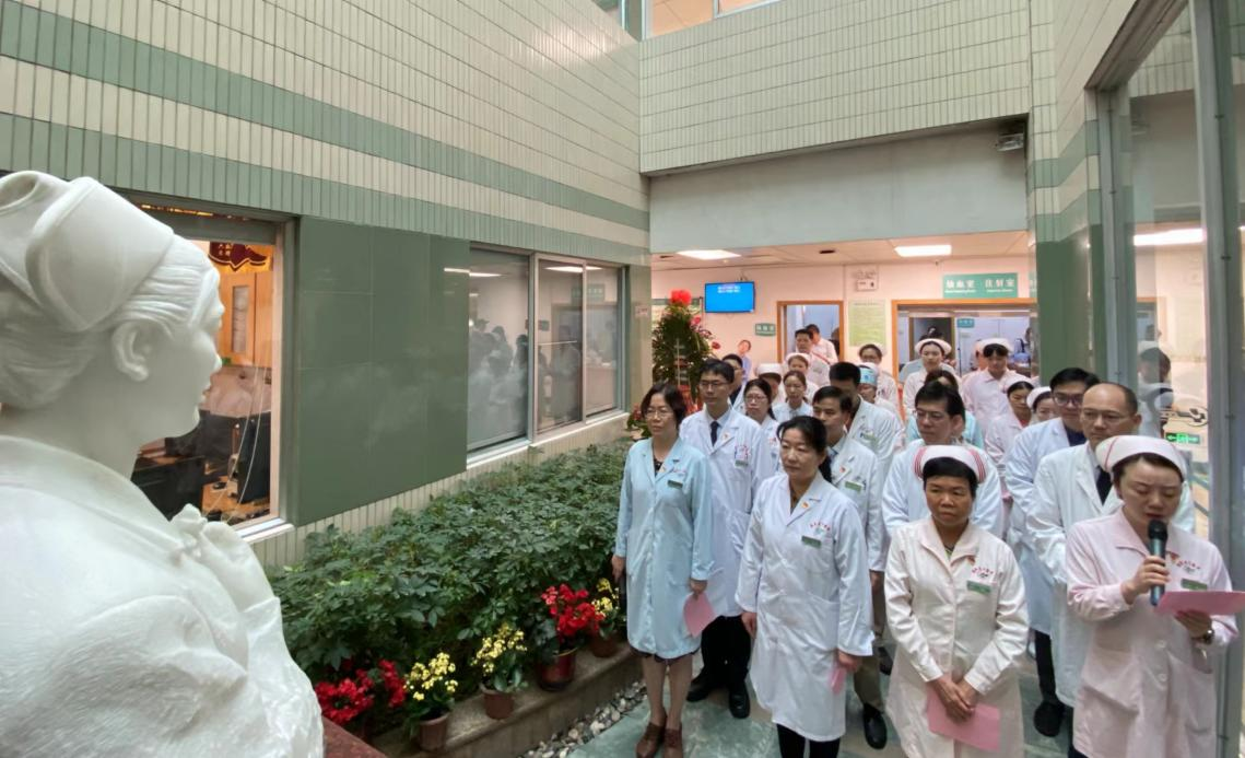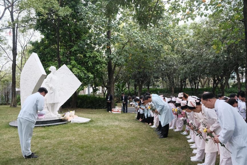 二沙岛医院医务人员代表向叶欣烈士雕像献上鲜花