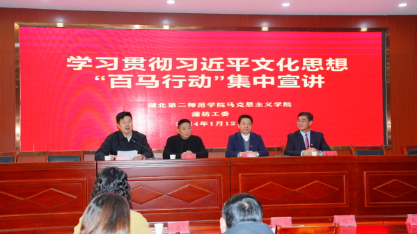 为深入学习贯彻习近平文化思想,全面贯彻落实全国宣传思想文化工作会议精神。1月12日,学习贯彻习近平文化思想“百马行动”湖北第二师范学院马克思主义学院宣讲团赴赤壁市蒲纺片区开展“百马行动”“五个一”系列活动,采用宣讲报告会、实践调研、文艺演出等形式,把习近平文化思想送到基层一线,助推乡村振兴。