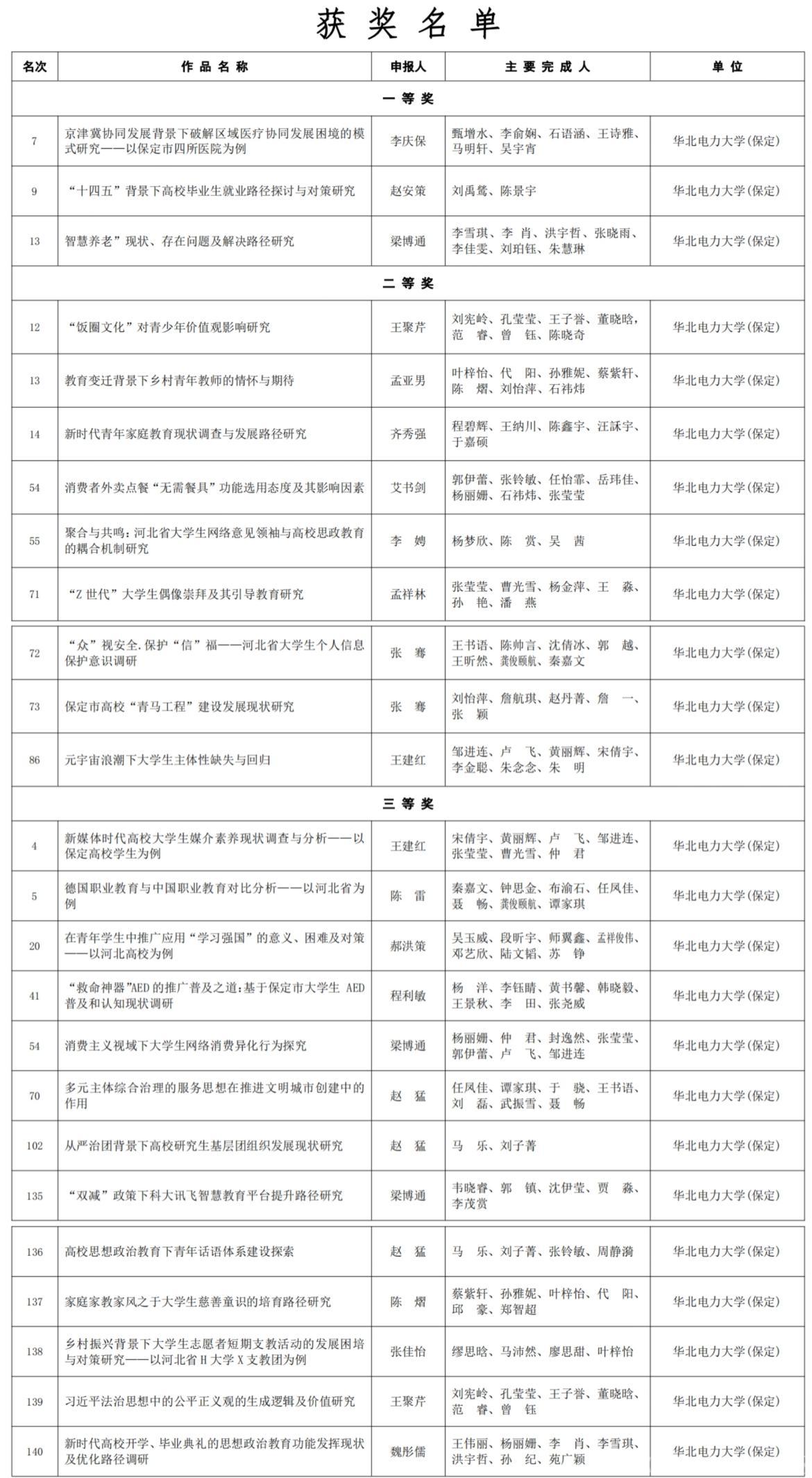 近日,由共青团河北省委、河北省社会科学院联合开展的2022年践行习近平新时代中国特色社会主义思想冀青工作调研大赛优秀调研成果揭晓。经专家初选及评审,保定校区共25项作品获奖,其中《京津冀协同发展背景下破解区域医疗协同发展困境的模式研究——以保定市四所医院为例》等3项作品荣获一等奖,《“饭圈文化”对青少年价值观影响研究》等9项作品荣获二等奖,《新媒体时代高校大学生媒介素养现状调查与分析——以保定高校学生为例》等13项作品荣获三等奖。