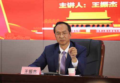 9月18日下午,学院党委书记王振杰在行政楼五楼报告厅以“不忘初心 牢记使命 努力创造无愧于新时代要求的新业绩”为题讲“不忘初心、牢记使命”主题教育专题党课。河北省委第八巡回指导组副组长、省委组织部考核二处调研员吕钰瑞同志,省委第八巡回指导组成员、省委政法委政治安全处副处长李力同志到会指导。