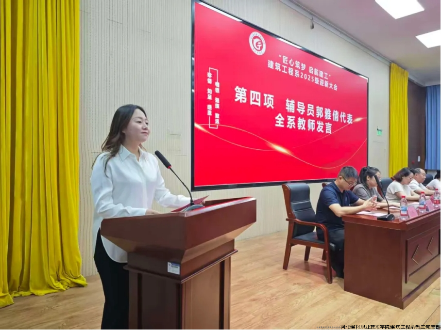 随后,教师代表郭雅倩发言。她结合自身教学经验,向新生们阐述了建筑行业的广阔前景与肩负的责任,分享了大学学习的方法与建议,希望同学们能够保持好奇之心,勤于思考,勇于实践,不仅要学会专业知识,更要提升综合素养和解决实际问题的能力。
