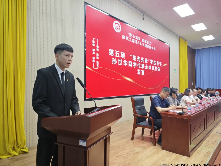 在校生代表2024级建筑工程技术2班孙世华同学分享了自己在校期间的学习成长经历与收获,从适应环境、参与学生会、备战“挑战杯”大赛等方面给予了学弟学妹们宝贵的建议,展现了建工学子积极向上的精神风貌。