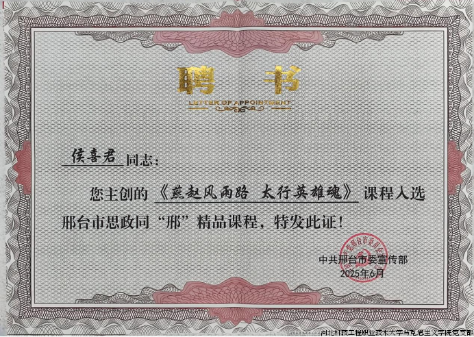 在启动仪式中,我院教师侯喜君现场演示“燕赵风雨路 太行英雄魂”虚拟仿真实践教学系统。通过3D实景高精度还原北大红楼建筑风貌与李大钊办公场景,以生动动画再现英雄人物的奋斗故事,借助交互式场景模拟打造沉浸式红色教育体验,带领学生穿越时空触摸历史脉络,感悟革命先辈精神,在虚实交融中传承红色基因、赓续精神血脉。同时,侯喜君教师荣获邢台市思政同“邢”课外讲师聘书,其主创的课程《燕赵风雨路 太行英雄魂》课程荣获邢台市思政同“邢”精品课程聘书;2名教师被聘为邢台市思政同“邢”优秀讲师。