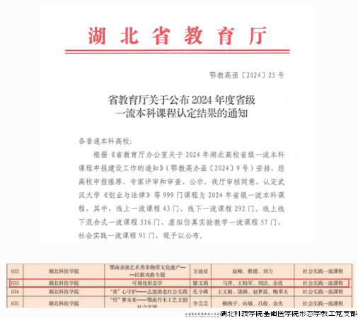 近日,湖北省教育厅公布了2024年度省级一流本科课程认定结果,湖北科技学院基础医学院形态学教工党支部的《形态学可视化》课程获批为省级社会实践一流课程,课程负责人是党员廖文莉老师,团队成员有马萍、王柏军、刘洁和余优。这一荣誉不仅是对该课程教学团队的高度肯定,也彰显了支部教师在教育创新与实践教学领域的卓越成就。