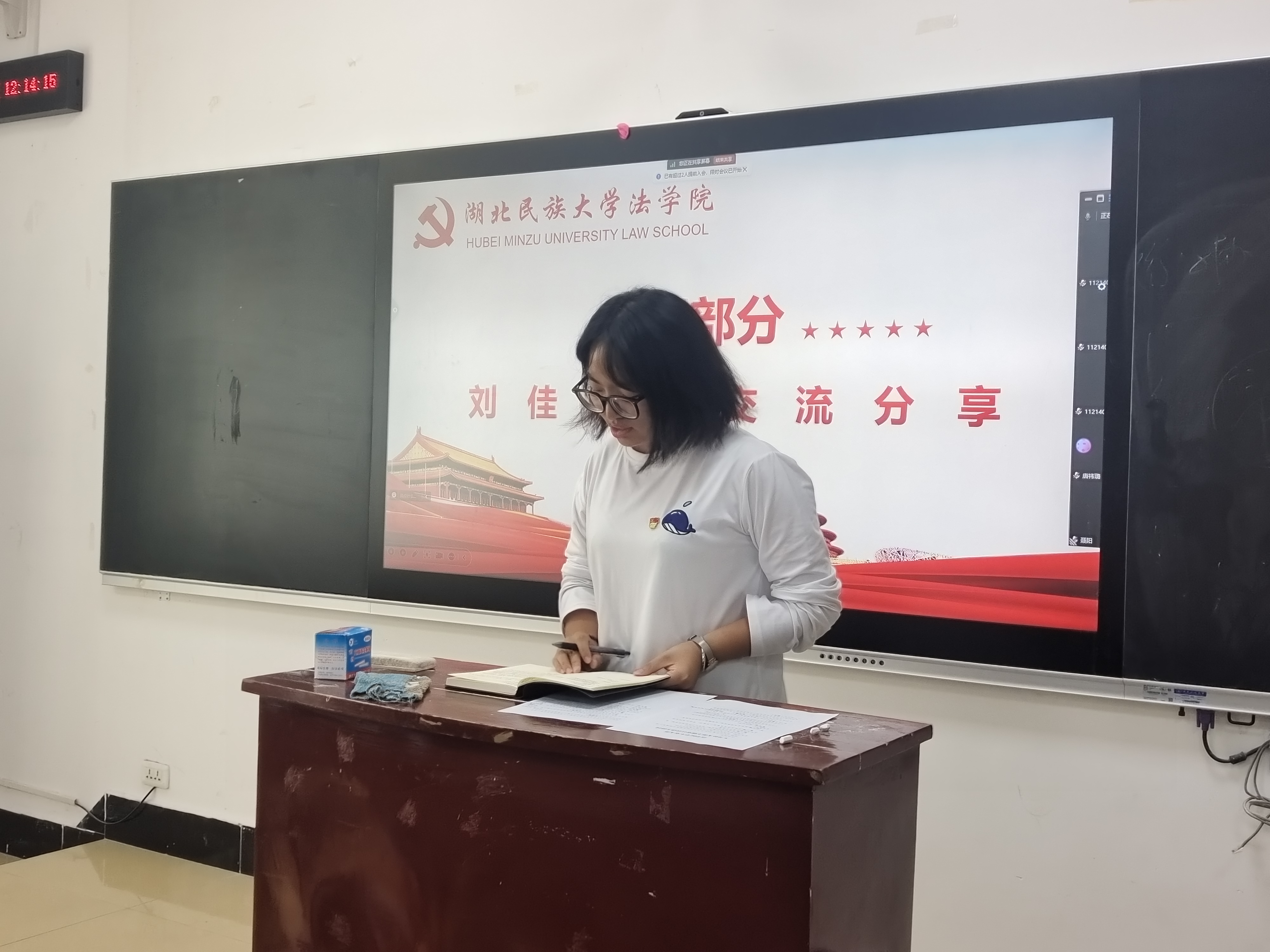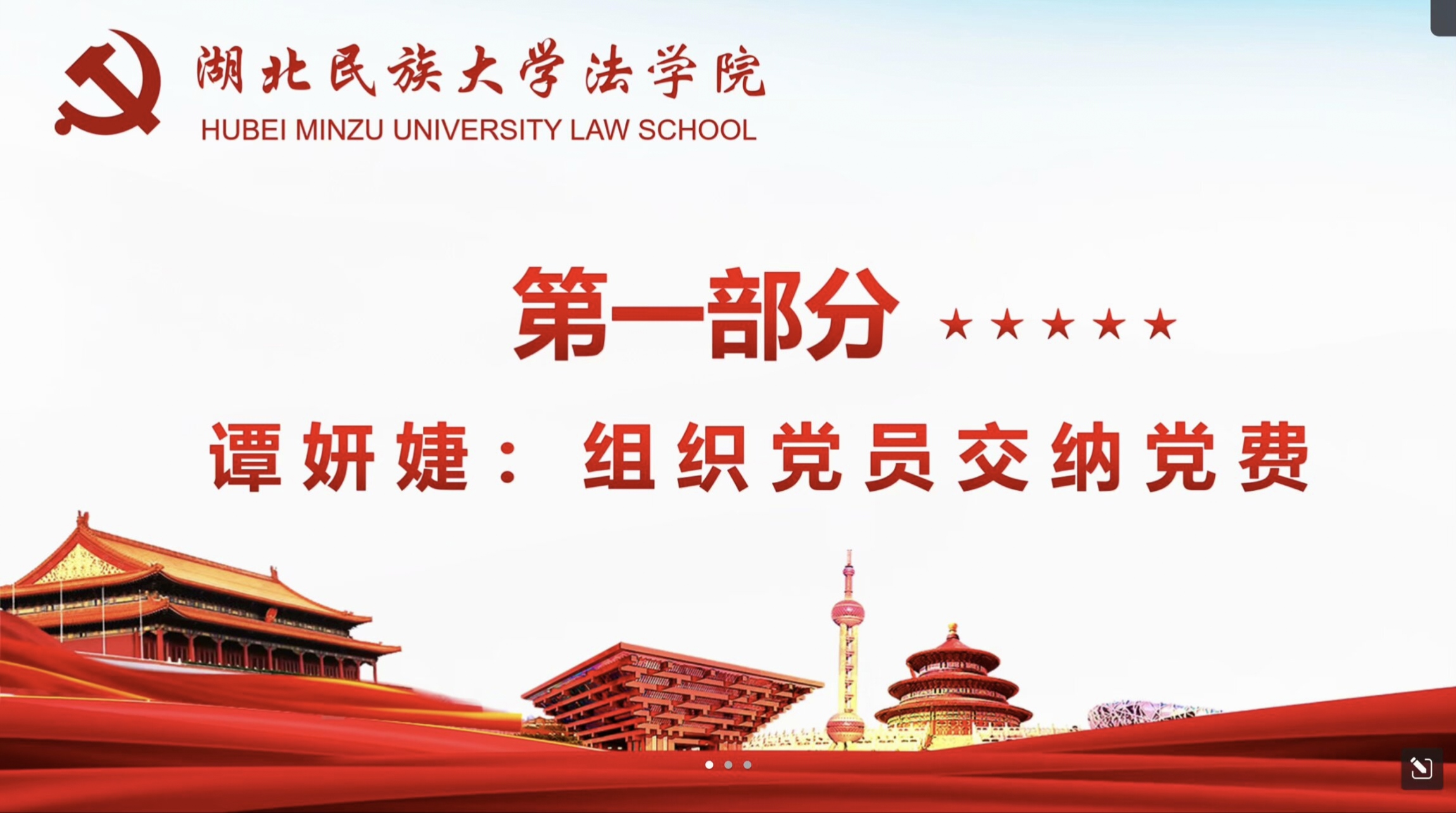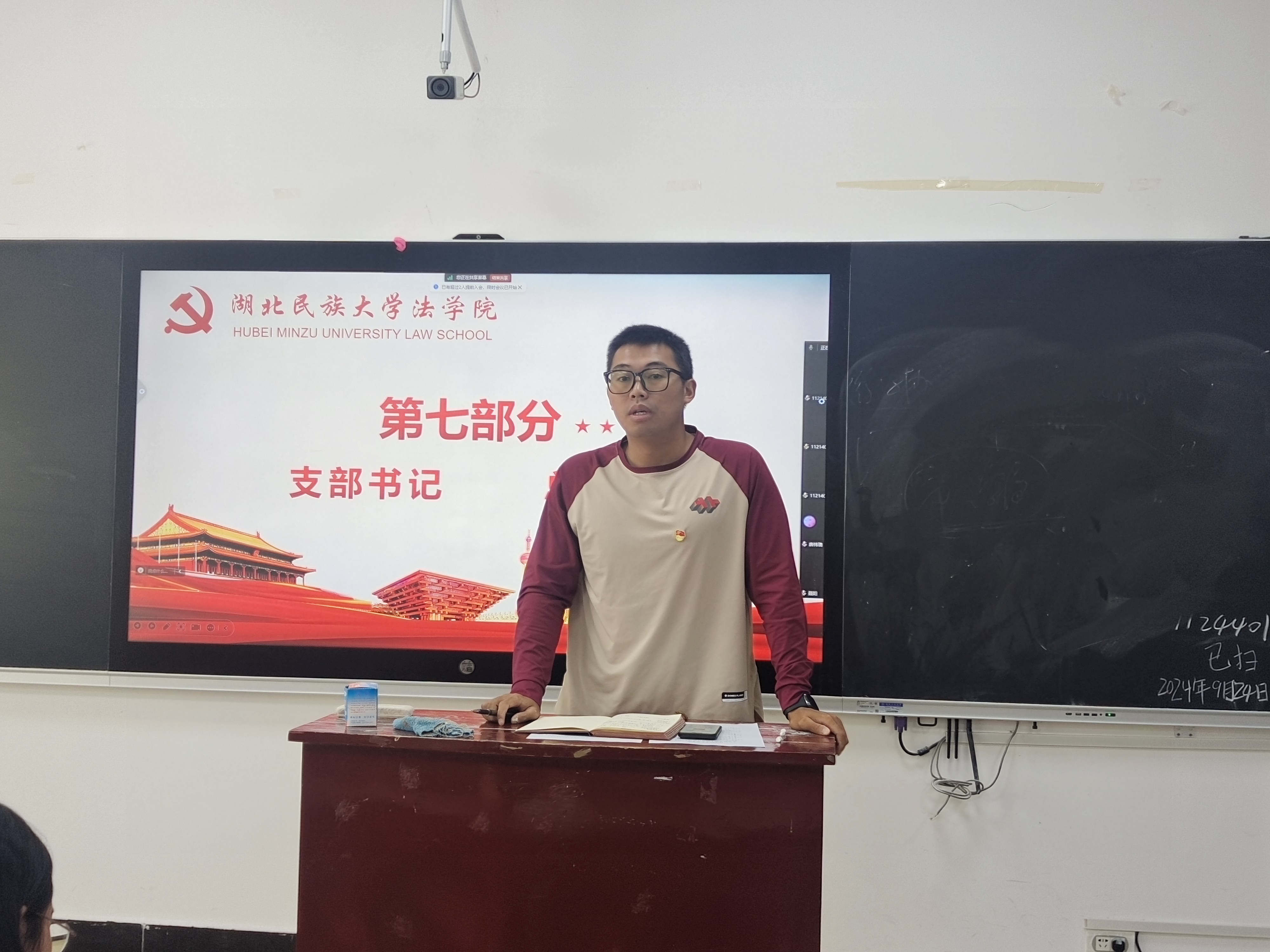 彭阳同志分享了法学院在校党员数据。学生党支部共党员41人,其中教师党员4人、学生党员37人,该数据激励在校党员同志珍惜为同学服务的机会,深入研习、用心领会党内重要思想的深邃内涵,时刻发挥党员同志的先锋模范作用。