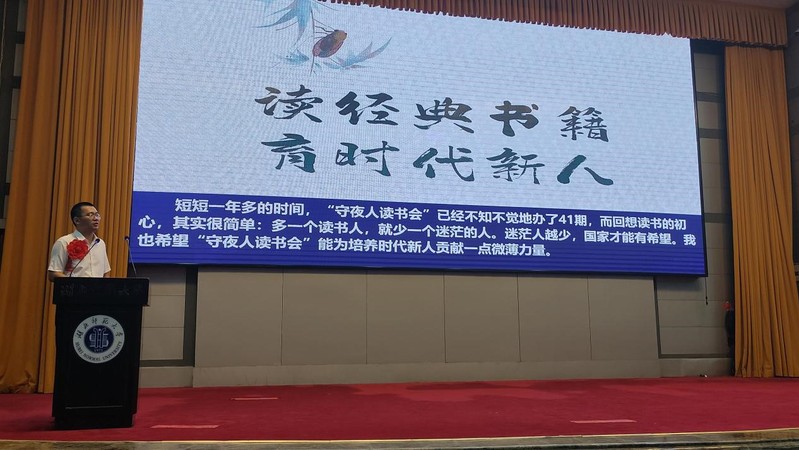 张磊博士是马克思主义学院的一名青年教师,虽然入职时间不长,但时刻不忘“传道授业”的崇高使命。他以平等心对待每个学生,利用课余时间组织学生读书学习,与学生们交流、交心。他利用周末休息时间,为学生进行答疑解惑,经常忘了时间,忘记回家,以至于被家人起外号“马上回”。为了激发学生的读书热情,他不仅每周定期组织举办“筑基”工作坊,还创建了“守夜人读书会”微信公众号,鼓励学生自发自愿写读书心得,在微信公众号上进行发布。他带领学生读《朱子读书法》,读《古人论文大义》,读各种经典,带领学生走进古人的精神世界。他表示,读经典,是现代人走出精神困境的重要方式,引导学生把读书当做一种生活方式,不管是去公园赏花,山间攀爬,还是静坐品茶,都可以是读书和思考的良好时机,读书可以融入我们生活的方方面面。至今,“守夜人读书会”已经举办了41期,人数也从最开始的一个人、五个人到几百人,学生也从马院、兄弟院系到校外各高校。谈及带领学生读书的初心,他说:多一个读书人,就少一个迷茫的人。迷茫人越少,国家才能有希望,希望“守夜人读书会”能为培养时代新人贡献一点微薄力量。张磊老师坚持带领学生读书,激励学生争做担当民族复兴大任的时代新人,用自己的方式践行教育家精神。