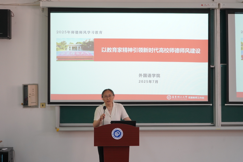 会上,全体教师开展了师德师风专题学习教育。外国语学院党委书记王喆作主题为“以教育家精神引领新时代高校师德师风建设”的辅导报告。她从加强师德师风建设的重大意义、高校师德师风建设的深刻内涵及教师违反十项准则典型案例分析等方面展开论述,要求全体教师要做到以案为鉴,认真学习和吸取典型案例的深刻教训,进一步强化自我约束,规范职业行为,坚决做到不踏红线、不跨雷区,共同加强学院师德师风建设。