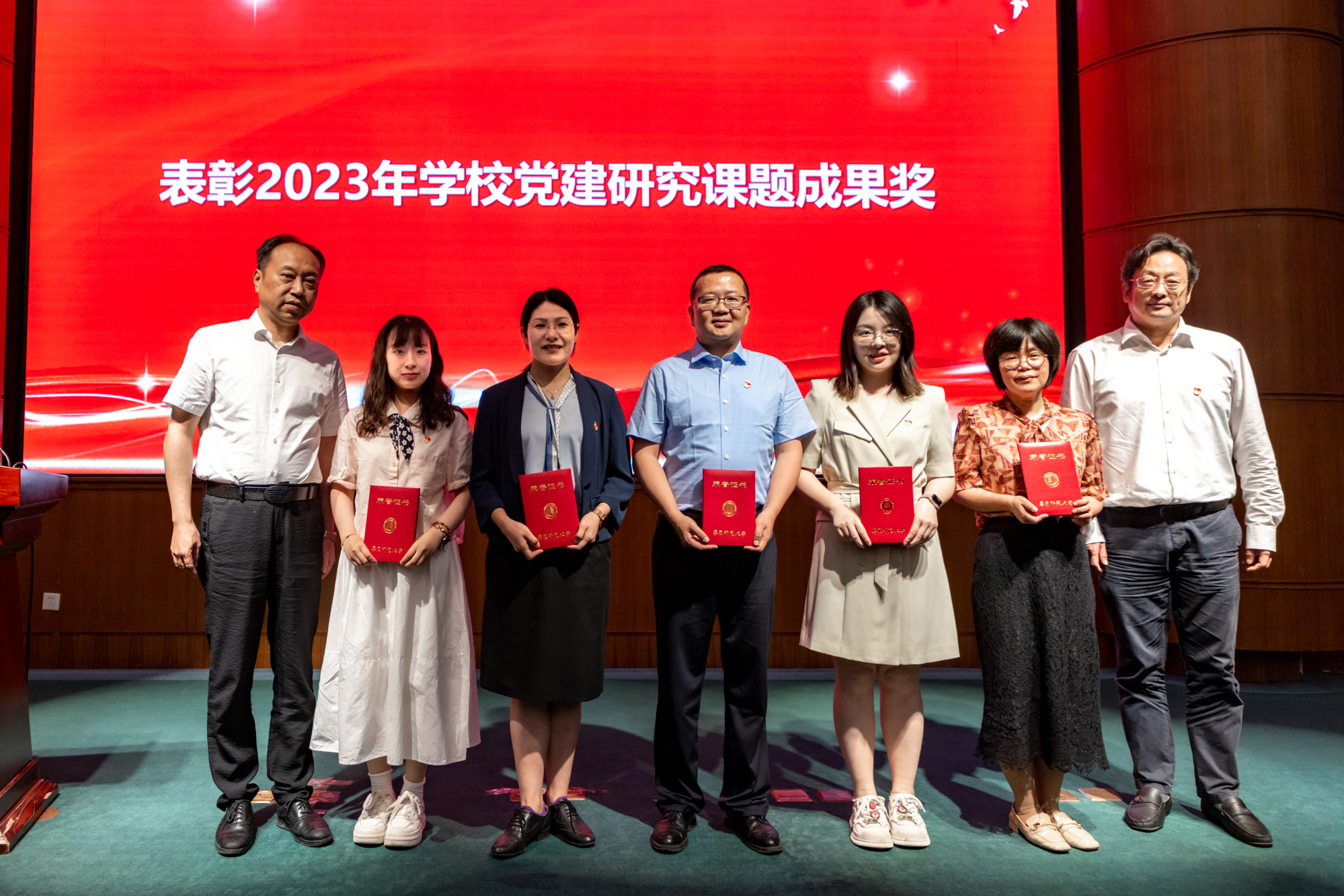 副校长戴立益,校党委常委、副校长施国跃为获得2023年学校党建研究课题优秀成果的项目颁奖