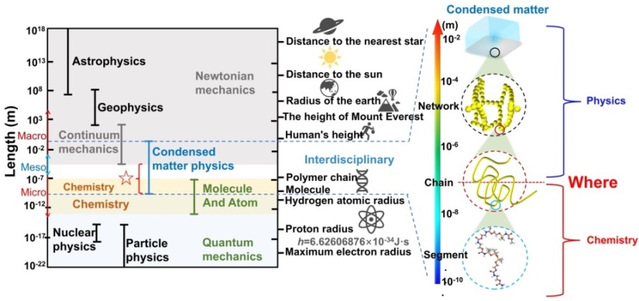 经典的相变问题,通常只需要建立其热力学平衡方程,而玻璃化转变较为复杂,不仅需要建立热力学平衡方程,还包括动力学平衡方程以及时空关联方程。吕海宝教授在研究中发现了玻璃化转变源于分子尺度与凝聚态尺度的跨尺度效应(标度律),建立了热力学非平衡态的自由能序参量平衡方程、“有序-无序”热力学模型及其随机运动概率统计方程,计算获得约19.5个单体组成的分子链段,其热力学运动达到临界平衡态;提出了分子纠缠(即协同效应),建立了重整化群论方程,计算获得了玻璃化转变的分子纠缠个数是e+1≈3.718,破解了分子与凝聚态临界跃迁的熵增原理,发现动态玻璃化转变时分子个数约为72个。
