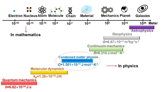 进而,基于爱因斯坦质能方程,吕海宝教授建立了能量和体积二元函数的时空关联方程,发现了分子尺度运动与凝聚态尺度运动的跨尺度效应,破解了“空穴体积假说”,建立了凝聚态尺度常数方程,通过分形迭代方程计算获得凝聚态尺度常数约为1.501×10-11 J·mol-1·K-1。