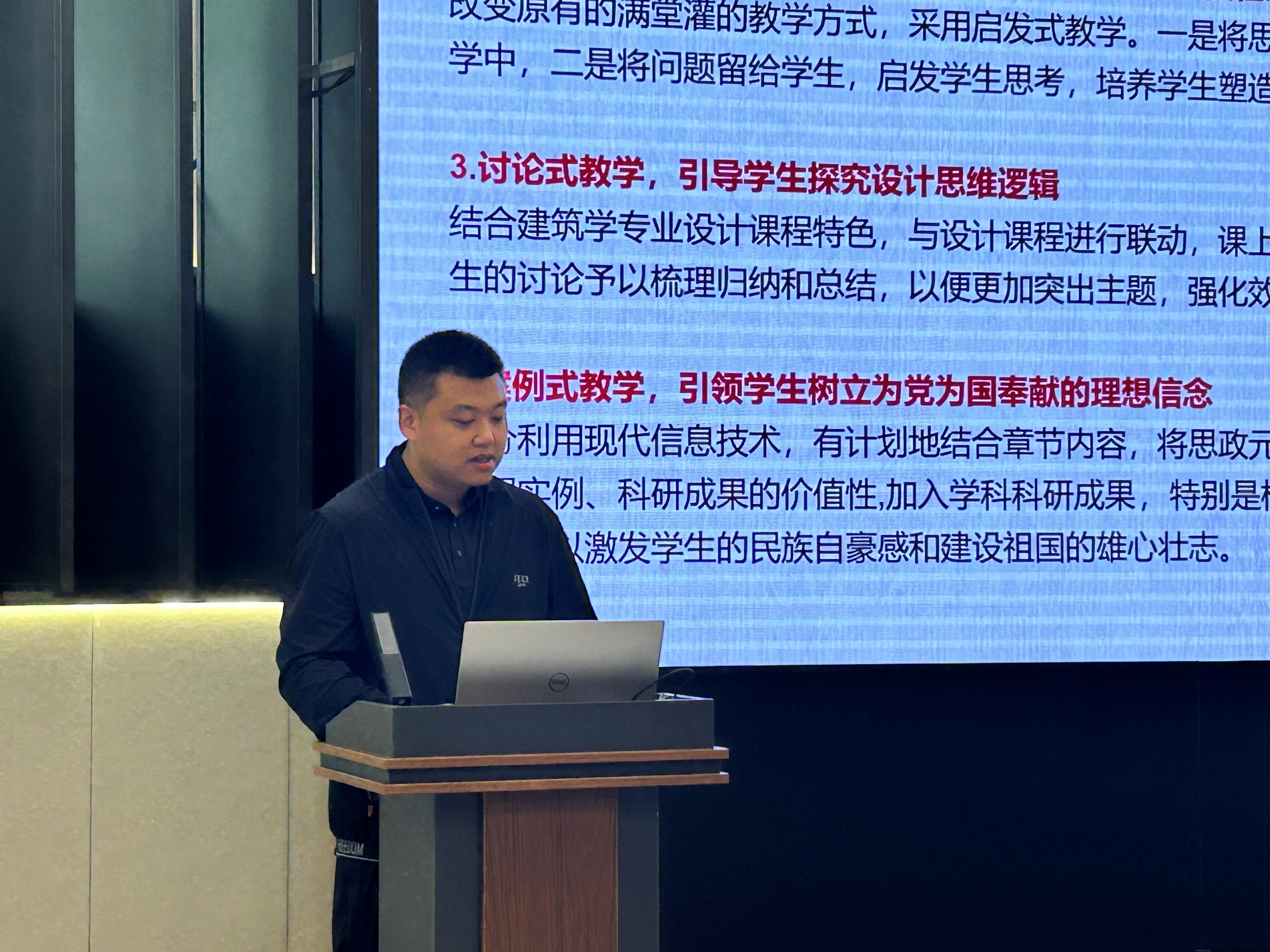 建筑与设计学院党委书记闫欢对本次比赛进行致辞,强调切实加强课堂教学、实践教学、信息化教学的能力建设,把课程思政讲得更有亲和力和感染力、更有针对性和实效性。参赛教师在10分钟的现场教学展示中,结合课程特色,充分挖掘教学内容的思政要素,力求将教学内容融入宏大的政治叙事,努力引导青年学生在政治认同、思想认同、理论认同的基础上,增强对党的创新理论的情感认同,厚植青年学生爱党、爱国、爱社会主义、爱人民、爱集体的真挚情感。评委老师针对每位参赛教师讲解的课程内容与教学方式有针对性地提出了具体提升方案,同时也对展示过程中的亮点给予充分肯定。此后,由哈尔滨工业大学首届“大思政课”教育教学创新大赛特等奖获得者于婷婷老师进行了挑战杯红旅赛道经验分享。