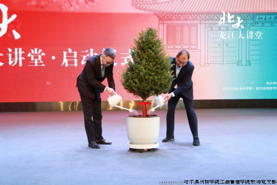 随后,姜国华与于越共同栽种一棵代表着“北大龙江大讲堂”要传递的人文精神以及要扎根这片沃土、坚定不移地传承力量的红豆杉。当北大遇见剑桥,当博雅塔对话龙塔,这棵共育的人文树将四季常青,传播知识与力量。