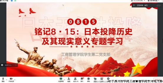 为铭记历史、缅怀先烈,深刻感悟抗日战争胜利的重大意义,8月15日,正值日本投降纪念日,工商管理学院学生第二党支部线上召开“铭记8·15:日本投降历史及其现实意义”专题学习会。支部全体党员参会,共同回顾历史、交流感悟,在回望胜利之路中凝聚奋进力量。