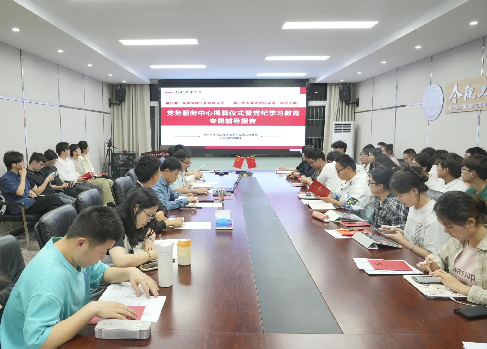 5月8日晚,全国“样板支部”、材料学院本科生第二党支部在屯溪路校区材料楼综合服务中心210会议室举办党务服务中心揭牌仪式暨党纪学习教育专题辅导报告。学院相关负责人、支部全体党员、党务服务中心全体工作成员共计70余人参加本次活动。