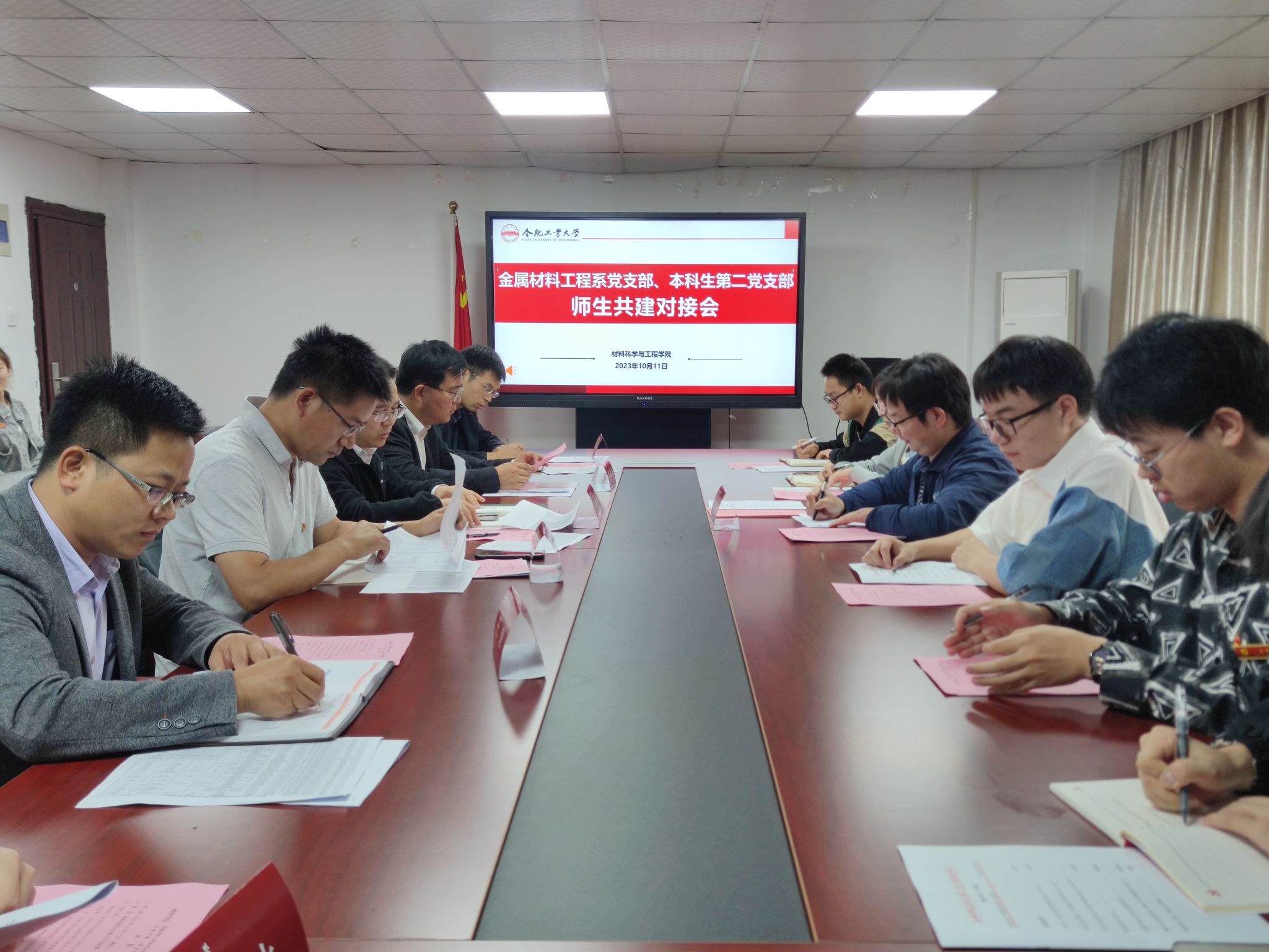 10月11日下午,材料科学与工程学院在材料楼三楼党员之家开展师生党支部共建交流活动。安徽省“样板支部”本科生第二党支部和金属材料工程系党支部师生党员参加本次共建交流活动。