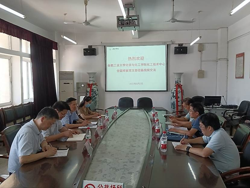 8月2日下午,2023“善水科技杯”华中大学生化工设计竞赛暨全国大学生化工设计竞赛华中赛区决在我校举办之际,合肥工业大学化学与化工学院化工技术中心全国样板党支部书记姚运金,党员教师杨则恒教授、刘小好博士、范小明博士一行来到化工学院交流考察,化工学院党委书记花金龙、副书记周玉俊及相关科室、教工支部参加交流会,会议由花金龙主持。
