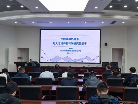 学科及专业建设座谈会中,李清彪教授分析了当前化学化工行业的新特点新趋势和本院的实际情况,从新工科教育适应社会发展需求的角度阐述了坚持学科差异性发展、坚持“化工做强,化学做精”的建设思想,并就” 领导艺术”与参会领导、教师进行了广泛交流。学术交流报告上,李清彪教授深入剖析了生成式人工智能的崛起和演进脉络,应用领域与研究趋势,详尽列举了众多国家和高校面对人工智能大潮时的积极响应与布局,并通过对教师、学生使用生成式人工智能数据的分析,全面揭示了生成式人工智能为产业和就业领域带来的全新机遇与潜在挑战。人工智能技术不仅改变了教育的方式和方法,更可能对教育内容和目标产生根本性的影响,展望未来高等教育人才培养模式,高等教育工作者需要深入思考人工智能如何赋能高等教育,以满足未来社会的需求。
