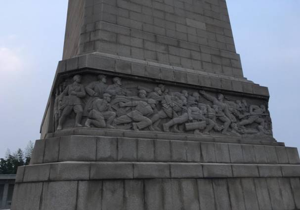 在成为一名正式党员之后,怀揣着不一样的心情再次来到淮海纪念塔,感受着历史的厚重以及革命先烈的红色基因。淮海战役烈士纪念塔高达38.15米,面东朝阳,依山而立,巍峨挺拔,气势雄伟,塔体正面镶嵌着1964年11月毛泽东主席亲笔题写的“淮海战役烈士纪念塔”九个鎏金大字,金光闪闪,熠熠生辉。塔的上端雕刻着由五角星和两支相交的步枪及松籽绸带组成的塔徽。塔座正面镌刻着鎏金碑文,记述着淮海战役的历史经过以及烈士们前赴后继、广大群众奋勇支援前线的英雄事迹。两侧为大型雕浮:右侧是人民解放军一往无前的英雄形象,左侧是人民奋勇直前的壮丽情景。站在纪念塔前,革命气息扑面而来,令人不禁感慨革命先烈不畏艰辛、勇往直前的坚韧品质。
