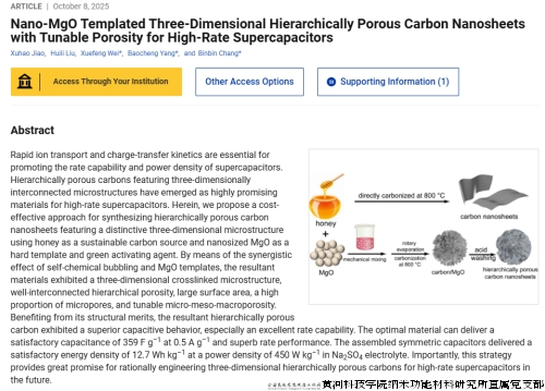 团队成员常彬彬博士指导的联合培养硕士研究生焦旭昊以第一作者身份在国际知名期刊《ACS Applied Energy Materials》以article形式发表了关于高倍率性能的多级孔碳基储能材料的最新研究成果,论文题目为“Nano-MgO Templated Three-dimensional Hierarchically Porous Carbon Nanosheets with Tunable porosity for High-Rate Supercapacitors”(文章链接:https://doi.org/10.1021/acsaem.5c02233)。该论文以我校和河南科技大学共同为署名单位,硕士研究生焦旭昊为第一作者,我校指导教师常彬彬副教授、杨保成教授以及河南科技大学魏学峰教授为共同通讯作者。