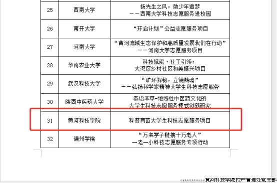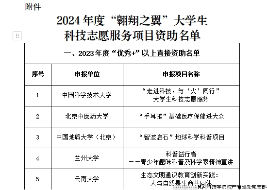 近日,中国科协公布2024年度“翱翔之翼”大学生科技志愿服务项目资助名单,河南省共有郑州大学、河南大学、黄河科技学院3所高校服务项目入选。项目通知发布后,全国共有179家相关单位参与申报,经省级科协遴选推报、形式审查、专家评审、经费审核、部门研究等程序,最终确定南京航空航天大学等47家单位,连同在2023年度获得“优秀+”等次以上的中国科学技术大学等13家直接入选单位,共60家单位作为2024年度“翱翔之翼”大学生科技志愿服务项目资助对象。