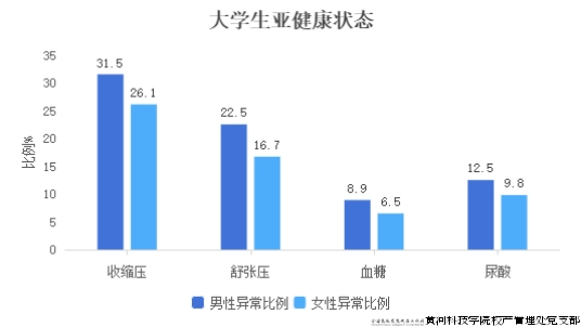 活动检测数据显示,参与检测的大学生群体中28.6%存在收缩压偏高,7.3%的学生空腹血糖超标;在尿酸检测中,男女差异显著,女性异常比例9.8%低于男性的12.5%,但女性尿酸值>400μmol/L的案例占比63%。