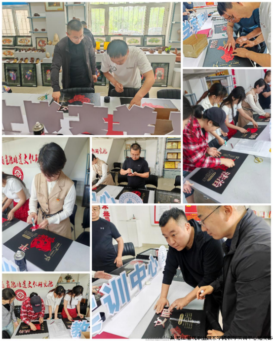 在党员教师的指导下,师生以“社会主义核心价值观”为创作主线,精选天安门、长征路线等象征性元素,运用鱼皮天然纹理与染色工艺,赋予作品深刻内涵:党员教师现场示范鱼皮画制作工序,同学们亲手实践裁剪、镶贴技法,在指尖流转中体悟“精益求精”的鲁班工匠精神;师生共同创作社会主义核心价值观主题画作,将鱼皮画文化特色与家国情怀相融合,以艺术语言诠释新时代奋斗精神;将数字精雕技术与鱼皮画、剪纸相结合,展现“非遗+技能+创新”的表达,彰显学院近年来产教融合育人特色。