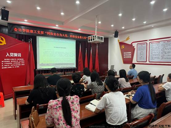2024 年 9 月 13 日,会计学院教工党支部在党员活动室成功开展了 “网络安全为人民,网络安全靠人民” 主题党日活动。本次活动旨在增强支部党员的网络安全知识,提高党员干部的网络安全意识和防护技能,发挥党员在网络安全建设中的先锋模范作用。
