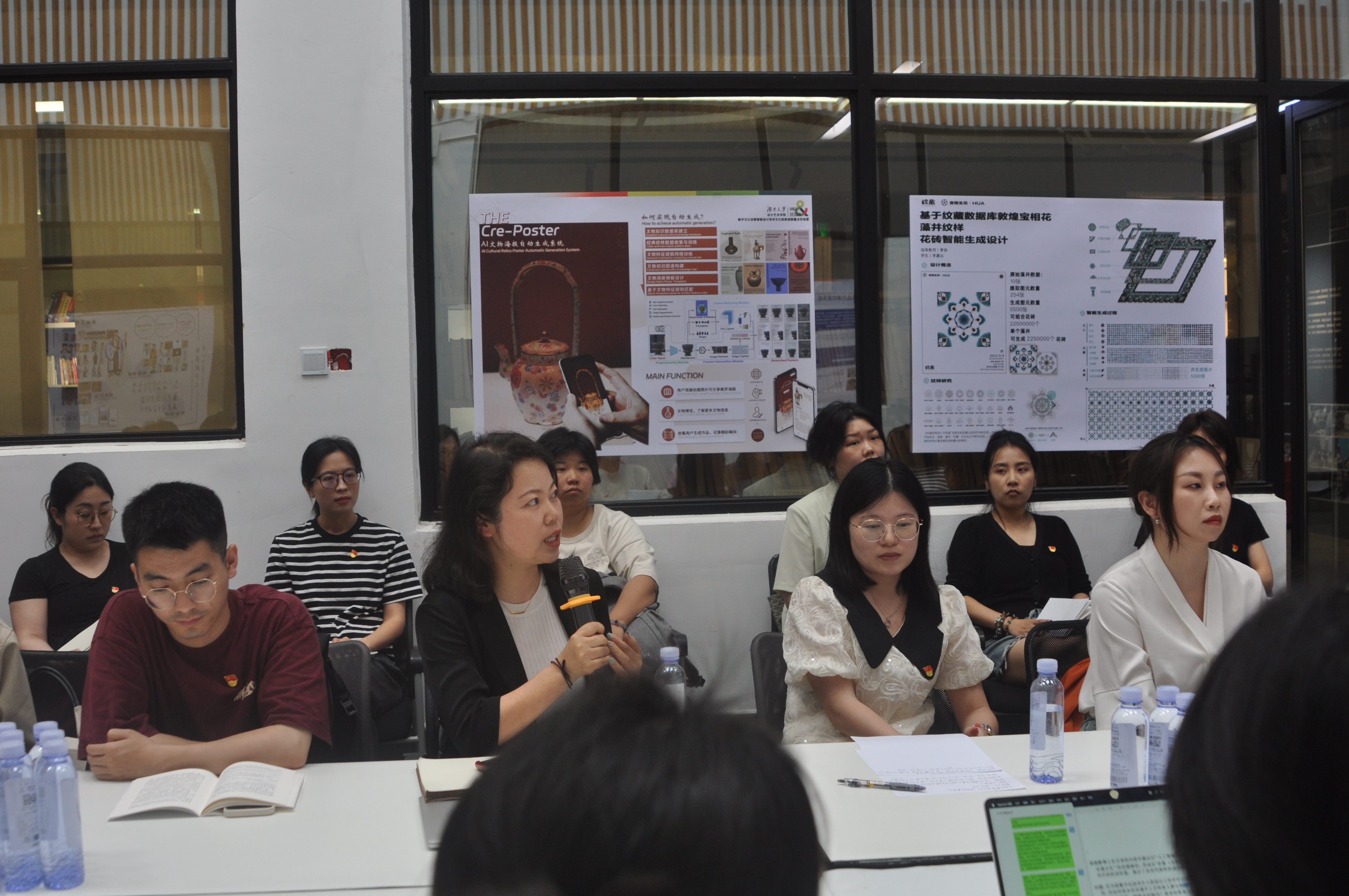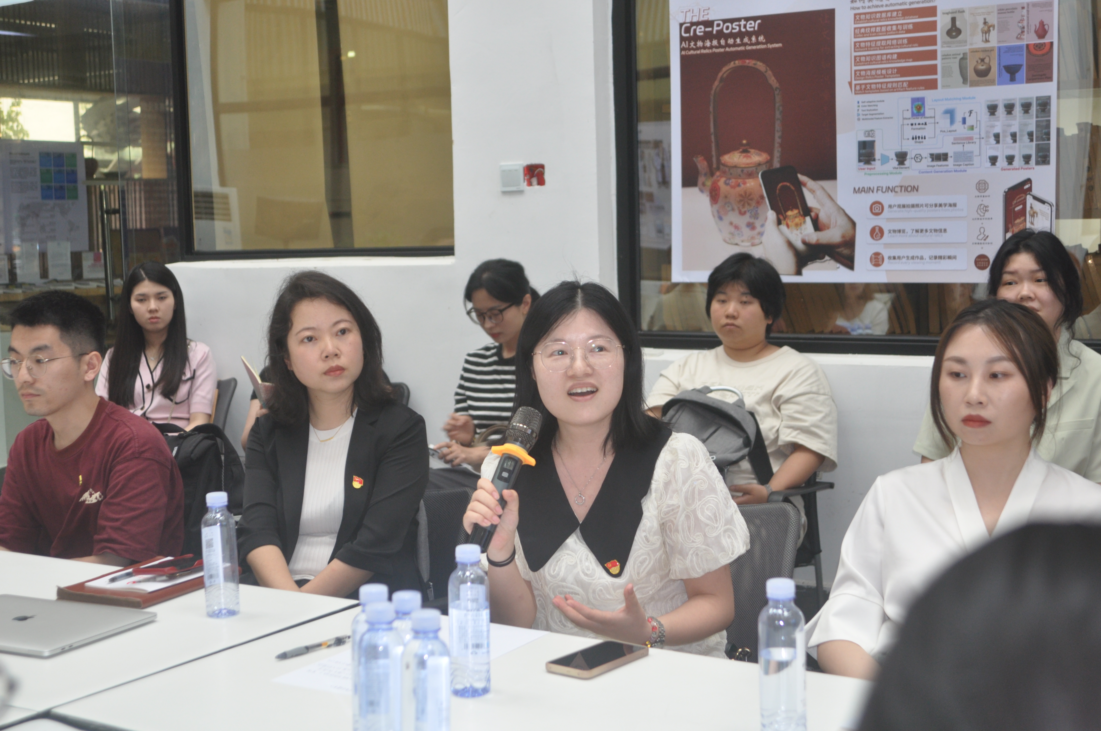 支部党员代表袁晓婧分享了“云上花瑶”挑花设计案例,展示了与花瑶白水洞村传承人奉堂妹的合作成果,以及AI技术在非遗文化保护与传承中的创新应用,不仅保护了花瑶挑花这一传统工艺,还展现了非遗文化与现代科技的完美融合。