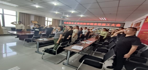 在教工支部副书记王辉的领誓下,全体教师紧握右拳,庄严宣誓,铿锵有力的誓言振奋人心、催人奋进,坚定了我院教师们从事教育事业的初心,也让立德树人的责任与使命愈发厚重神圣。
