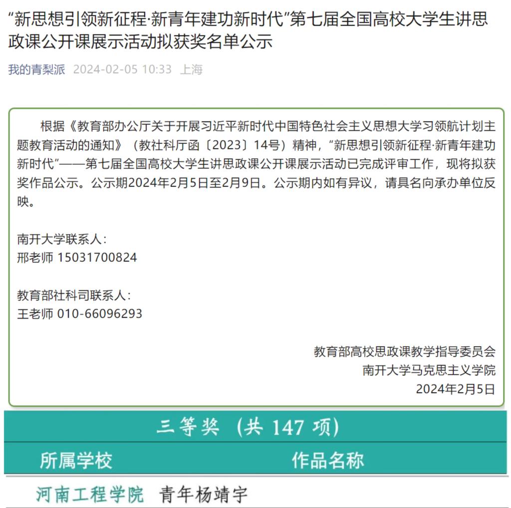 近日,根据第七届全国高校大学生讲思政课公开课展示活动评审结果公示,由我校马克思主义学院和校团委联合推荐的学生作品《青年杨靖宇》在“新思想引领新征程·新青年建功新时代”——第七届全国高校大学生讲思政课公开课展示活动中获得三等奖,系近年来我校首次获得该比赛奖项的学生作品。