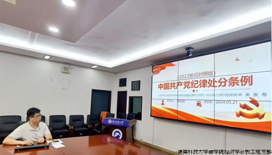 5月21日,商学院经济学系教工党支部在三教301开展五月份主题党日活动。本次主题党日以“巩固拓展学习贯彻习近平新时代中国特色社会主义思想主题教育成果”为主题,分为理论学习、交流研讨、观看警示教育片、讲授党纪学习教育专题党课等四个环节。支部书记王鹤主持活动,全体支部党员参加活动。