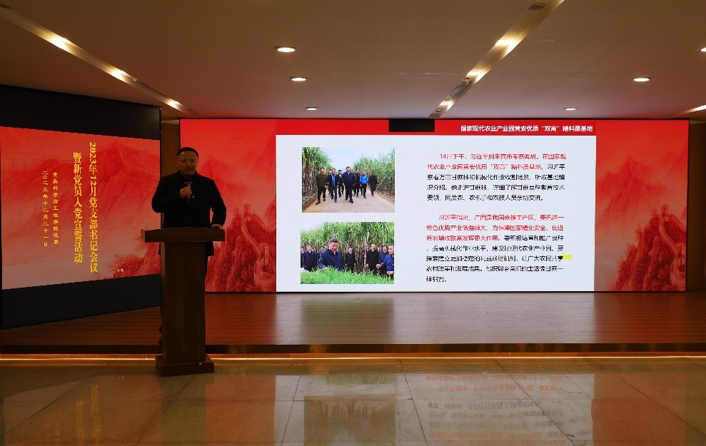 会议第一议题:学习习近平总书记在广西考察调研时的重要讲话精神。学院党委书记冯向阳同志带领与会人员学习了习近平总书记在广西考察调研时的重要讲话精神,深刻体会“牢牢把握高质量发展这个首要任务和构建新发展格局这个战略任务”重大意义。学院党委委员、副院长、食品营养与健康研究所党支部书记黄强结合国家建设制造业强国的战略及华工食品学院学科建设和人才培养的初心使命,分享了自己曾经带队去糖厂实习的经历。“总书记说食糖是重要的副食品,大家为此辛勤劳动,为千家万户送去了甜蜜。希望大家不断学习新技术、钻研新工艺,为糖业发展作出新贡献。作为一名食品专业的党员,肩负“民以食为天,食以安为先”的使命,坚守科研守初心,深耕专业破难题,努力为乡村振兴贡献一己之力。”