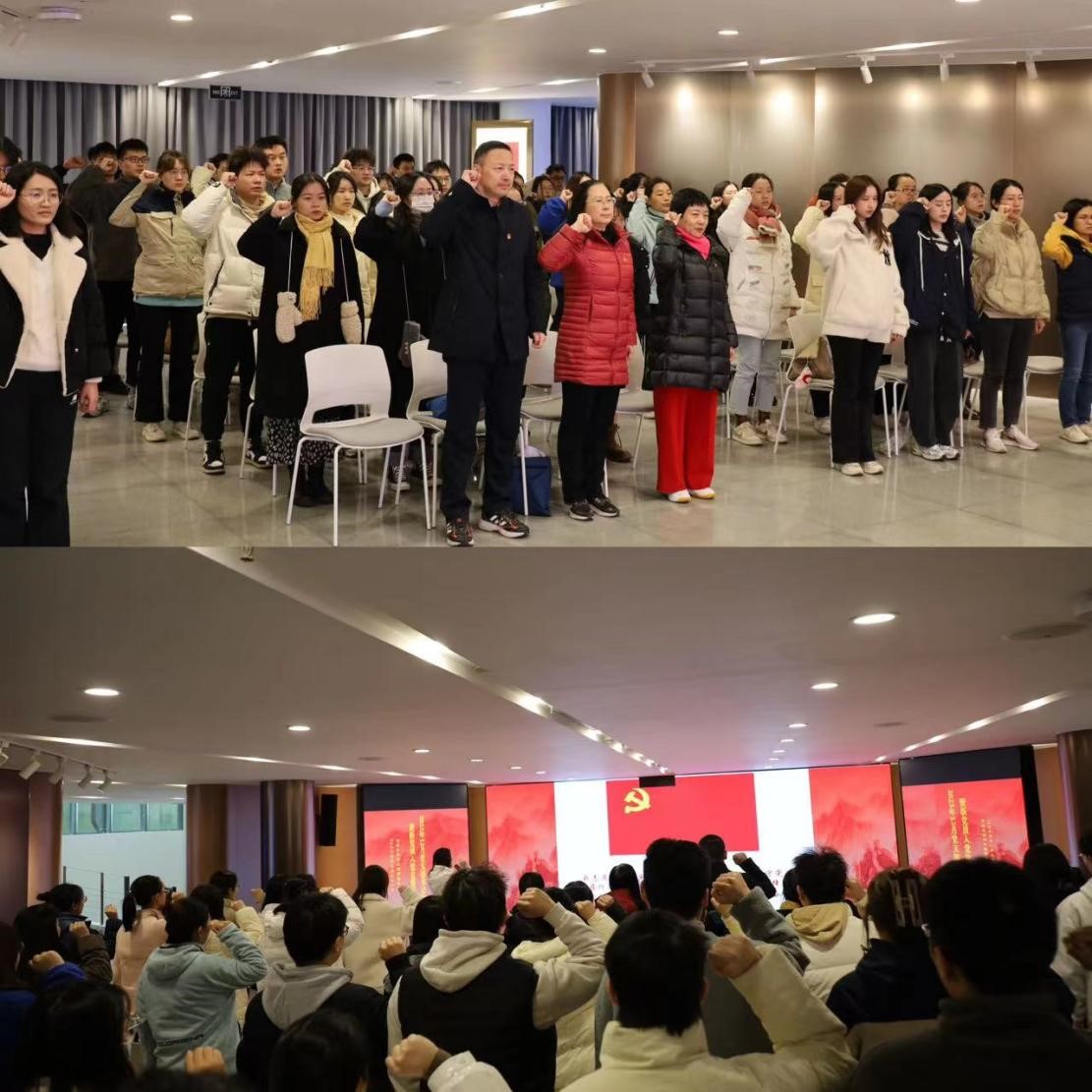 宣誓环节,与会党员及新发展为预备党员的同志胸戴党员徽章,高举右拳,面向鲜红的党旗庄严宣誓,共同发出为共产主义奋斗终身的铮铮誓言。