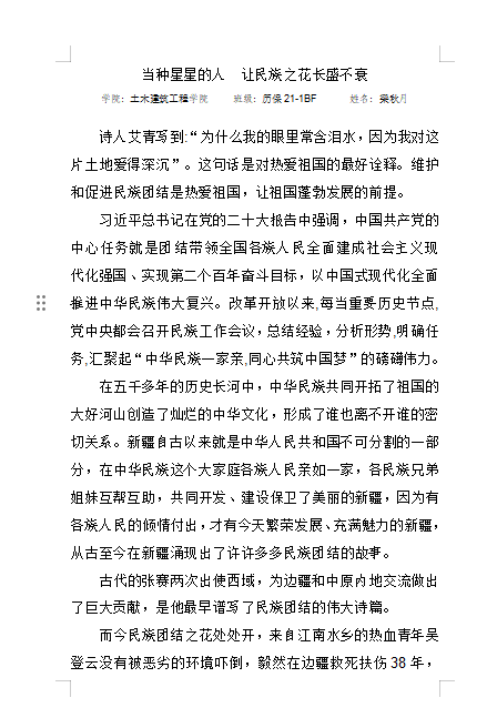 支部联合学院团委开展以“同心石榴籽 共铸中国梦”为主题的铸牢中华民族共同体意识教育主题征文评选活动。活动开展以来,共计收到近百篇征文投稿,土建学子通过分享中华民族一家亲的感人故事、宣讲身边人投身民族团结进步事业的真实事例,进一步深化广大师生对民族政策的思想认识,深化民族团结进步教育,为铸牢中华民族共同体意识培根铸魂。