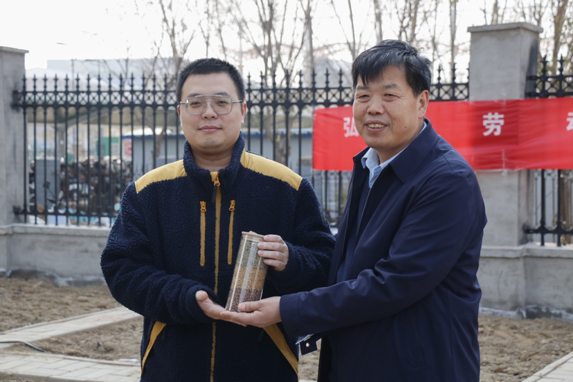 农学院党委书记贾磊、院长王道文为郑州市建业小学教师代表赠送由学院精心选育的彩麦和玉米种子,用"金种子"激发小学生的学农热情,引导他们知农、爱农、亲农、尚农,为加快建设农业强省贡献自己的一份力量。