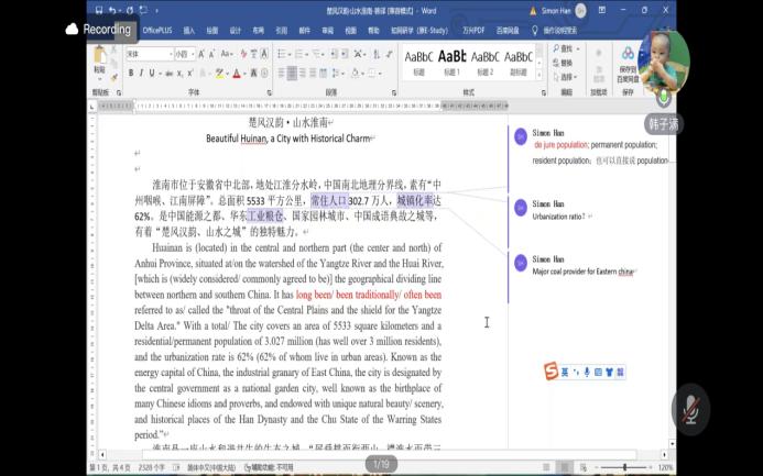 在本次授课过程中,韩子满教授首先就学生们的问题发表自己的看点,表示赛题中所出现的与淮南历史相关的词汇较为棘手,并且高度认可了此次赛题。针对以上问题,韩子满教授就自己查询的相关淮南的历史文化,与外院同学分享,帮助学生们避“坑”,让学生们对部分文化背景有了更深刻的理解,为参赛学子提供了宝贵的经验,同时也激发了外国语学院学生的参赛热情。此外,韩教授将一些翻译中常见的错误、对于专有词的误解,为同学们进行了分析与讲解,这让同学们对翻译有了进一步认识,也为在线教师提供了新的思路。