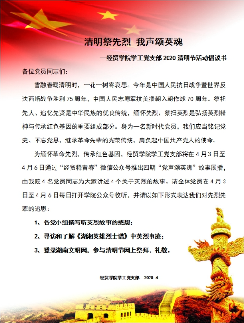 (通讯员:颜婷婷)2020年4月4日14:30,经济贸易学院学工党支部全体党员在线上开展“清明祭先烈,我声颂英魂”主题党日活动。本次活动为期4天,以党员收听“党声颂英魂”故事展播的形式进行。