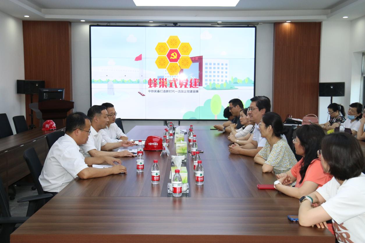 参观结束后,大家来到会议室一齐观看了中铁装备集团用创新思维打造“蜂巢式”党建品牌的宣传片。双方就党建工作进行了面对面的深入交流。中国中铁工程装备集团机关党委书记金志强介绍了集团党委以“蜂巢式”党建磁力场,汇聚改革发展强大正能量的顶层设计思路,强调了党建引领企业发展的重要性。党委工作部部长刘灿讲述了“蜂巢式”党建品牌的具体创建过程。党建以党员为“蜜蜂”,以党员责任区为“蜂孔”,以党组织为“蜂巢”,以“党员心中有群众,群众身边有党员”为核心,努力打造新时代一流国企党建品牌。他还提到了集团“廉善”“廉能”“廉敬”“廉正”“廉法”“廉辨”的“六廉兴企”廉政文化建设。外语学院英语专业教研室党支部书记王玖炜介绍了支部积极开展 “活力工程”建设,通过党建引领强活力、党建立项葆活力、赓续援非增活力、中医特色添活力、课程思政育活力、社会服务显活力,以党建为引领,坚守立德树人初心使命,创新推动“全国党建工作样板支部”培育创建务实有效开展的情况。