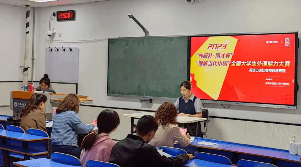 2023年10月16日晚,“国才杯”“理解当代中国”全国大学生外语能力大赛口译比赛校园选拔赛在教学楼A549教室成功举行。此次比赛赛题包含视译、交替传译等多种形式,其中交替传译包括英译汉和汉译英两个部分,内容紧扣“理解当代中国”赛会主题。尽管材料难度较大,信息量多,但是各位选手在考场上从容不迫,各展风采。经过激烈角逐,叶扬青和肖翊琦两位同学获得特等奖,将代表我校参加省赛。比赛另评选出一等奖1名,二等奖2名,三等奖4名。比赛结束后,评委孙俊芳教授针对同学们的表现进行了点评,肯定了选手们优异的表现,并就普遍存在的问题给出了意见,鼓励同学们不断提升专业素养,讲好中国故事,服务国际传播。