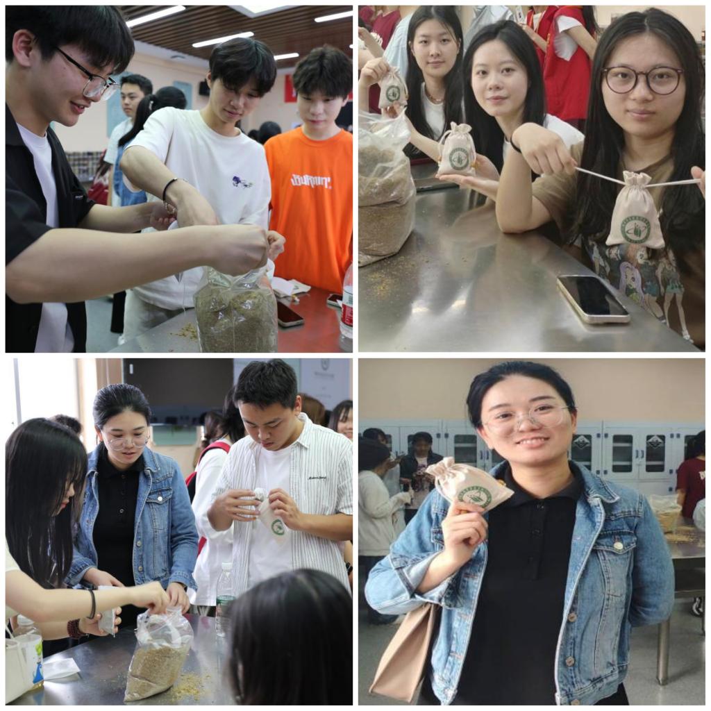 活动最后一站是中药香囊的制作。讲解员通过中药香囊的用途、文化内涵以及制作过程让大家更全面了解中药香囊,随后指导师生制作,将首乌藤、百合、远志等药材研磨成的细粉包进香囊中,一袋袋雅致的安神助眠香囊受到了大家的喜爱。