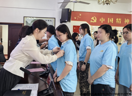 典礼第一议程,是庄重而温馨的佩戴校徽环节。中医药大学药学院领导为新生一一佩戴校徽,标志着2025级新生正式成为两校联合培养项目的一员。这枚镌刻着“文明、求实、继承、创新”校训精神的徽章,不仅象征着学子们开启了学习生涯的新阶段,更代表着中医药文化的传承与使命。