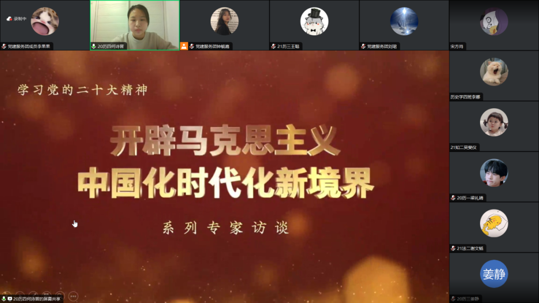 为加深我院学生党员对马克思主义中国化时代化知识的理解,强化党的二十大理论学习,在以学铸魂中筑牢信仰之本、补足精神之钙、把稳思想之舵,进一步提升自身服务能力。12月14日19:30,我院学生党支部开展了“不断推进马克思主义中国化时代化”线上主题党课。此次党课全部学生党员参与,由我院学生党员何诗晋讲授党课,2022级历史学3班钟毓嘉担任主持人。