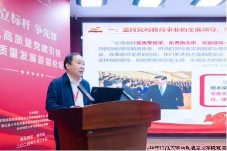 全国党建工作标杆院系、华中师范大学马克思主义学院党委书记孙永祥以“强化基层党组织政治功能和服务功能的发挥”为主题,介绍了该学院强化基层党组织的政治功能和服务功能的发挥,以“双融双促、共推共抓、联建联创”工作理念来实现”以业务工作实绩检验党建工作成效“的系统做法。