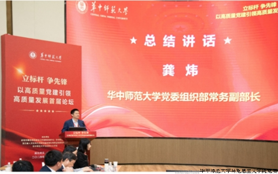 华中师范大学党委组织部常务副部长龚炜作总结讲话,他向参加论坛的领导、专家表达了感谢,并对此次论坛的丰硕成果进行了全面总结,对各个交流单位的典型做法进行了进一步推介,对未来高校党建持续推进“一融双高”工作进行了展望,提出加强顶层设计,构建以高质量党建引领高质量发展的新格局,夯实基层基础,激发以高质量党建引领高质量发展的新动能,强化党建赋能,塑造以高质量党建引领高质量发展的新优势,并寄希望打造高校党建高质量发展新局面。