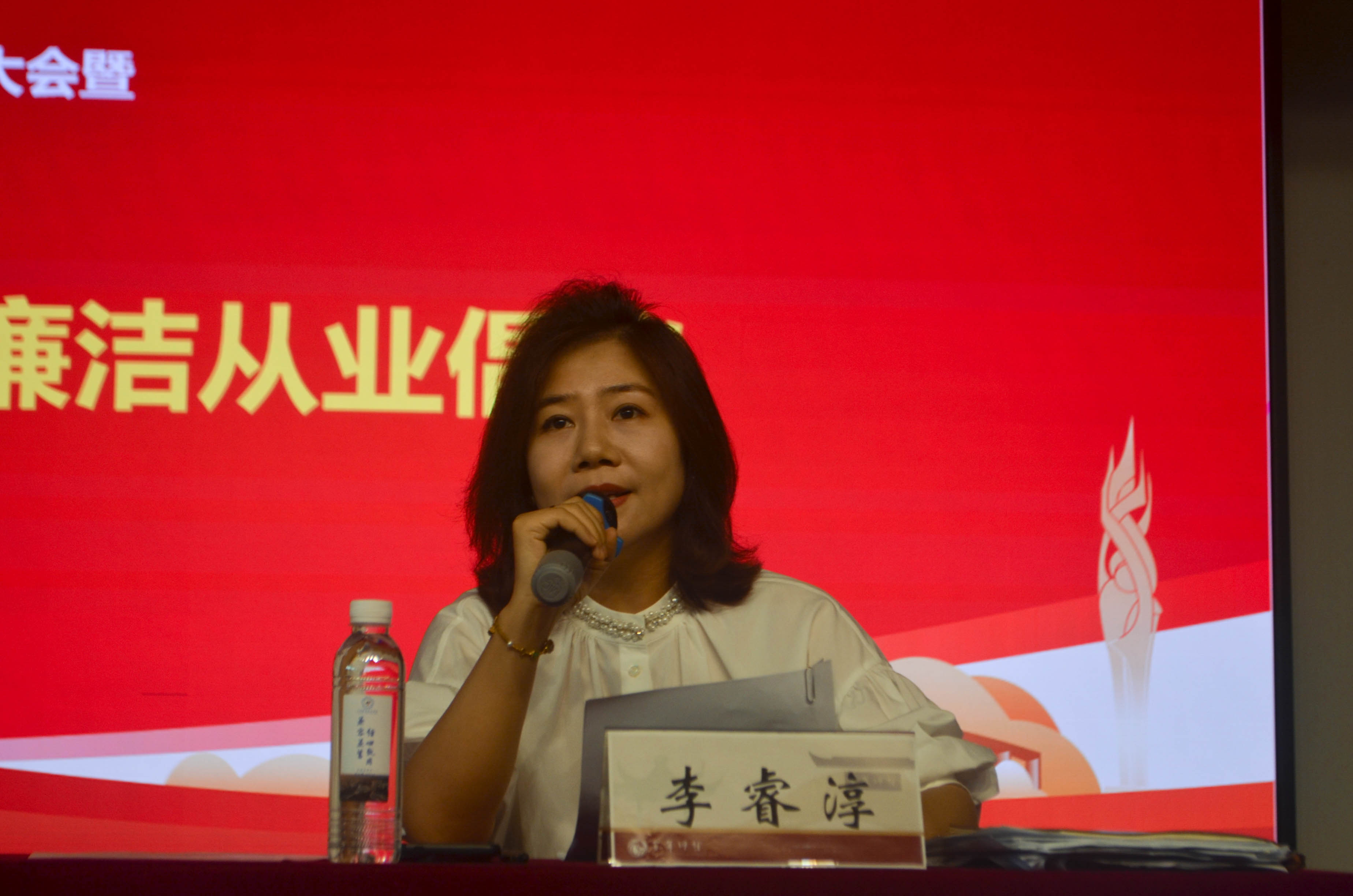 师范学院纪委书记李睿淳向全体毕业生党员发起了廉洁从业的倡议,她希望全体毕业生党员珍惜青春时光、清正廉洁从业,并对毕业生党员提出三点希望:坚定理想信念,自觉加强道德修养;加强廉洁意识,倡导良好风气;坚持经世致用,牢记金职精神。