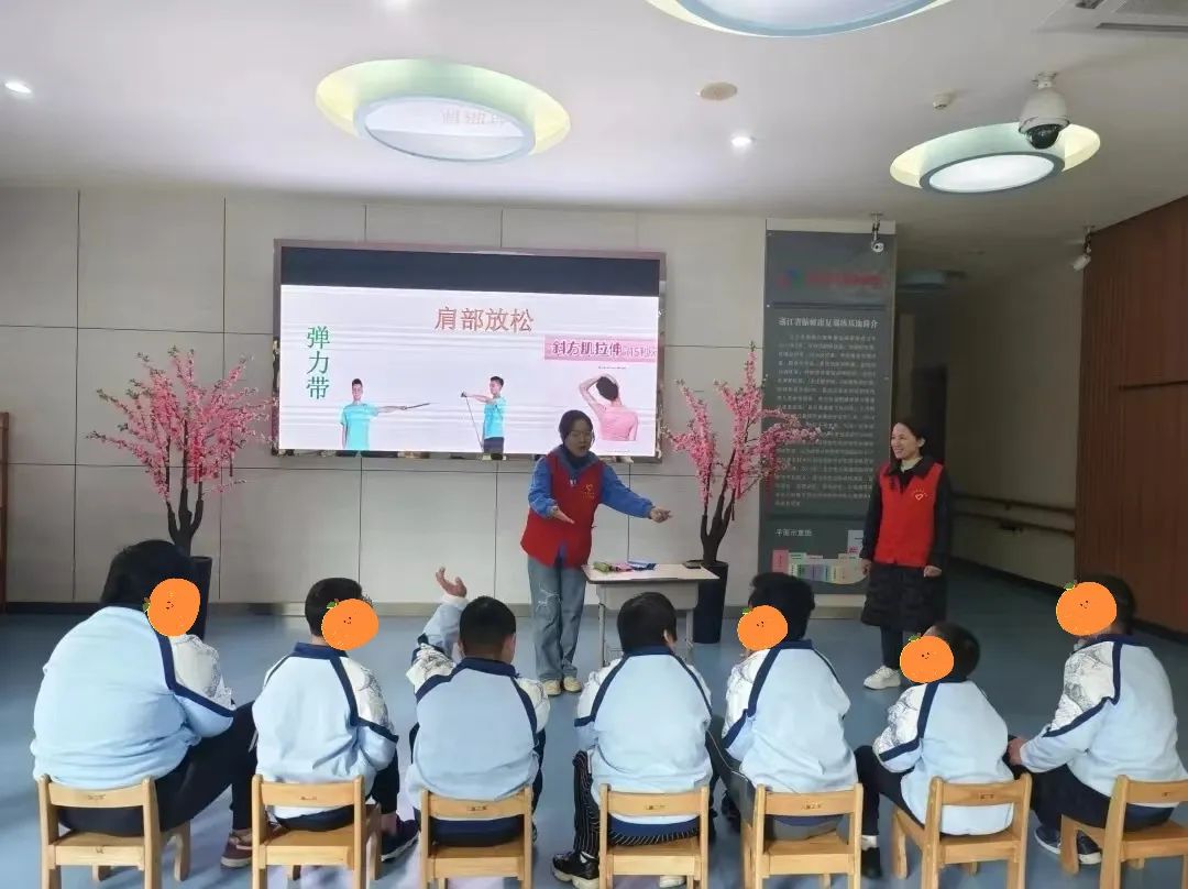 “小朋友们,平常大家上课写字之后,是否会感觉到颈关节和腕关节疲劳?”在课程的最后,志愿者们还配合拉力带,腕力球等运动康复辅具,给大家进行了课后康复舒缓小知识的指导,让大家养成科学健康的学习习惯。